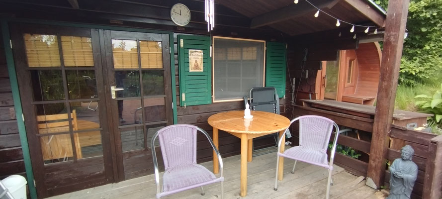 Naturbadesee, einer Feuerstelle, einer Faßsauna mit echtem Feuer und zwei kleinen Holzhütten am See (zum Übernachten) und schönen Plätzen zum entspannen.